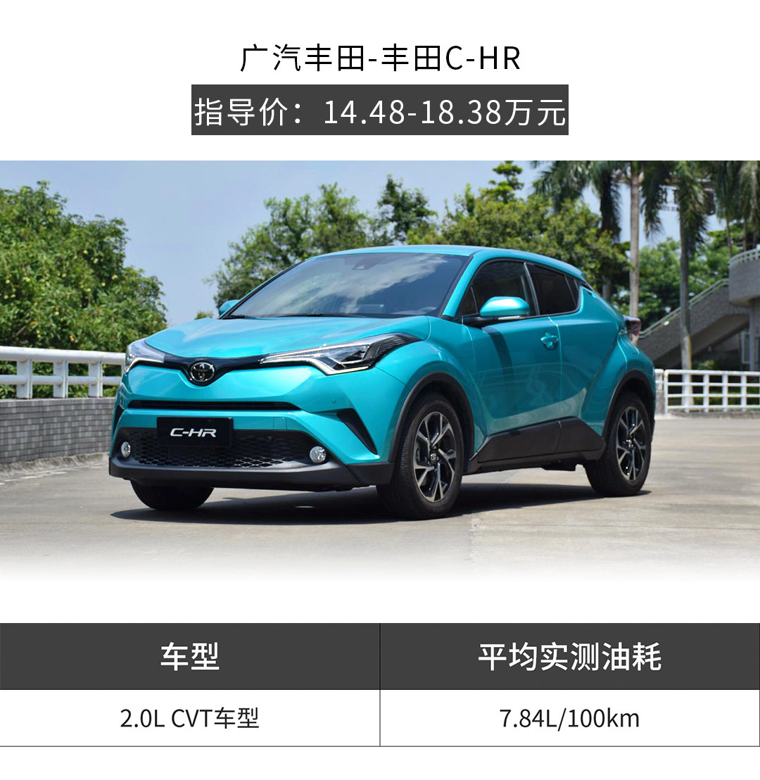 丰田C-HR可以说是2018年最具代表的全新小型SUV之一。2.0L+CVT的动力组合为全系标配,采用了高速燃烧技术,热效率高达40%,在保证动力足够的情况下油耗水平还比较低。城市工况平均油耗大约在百公里7升多,纯高速工况下百公里5升左右。对于一台自重超过1.5吨、排量2.0升的SUV来说,这份油耗成绩单可以说是挺漂亮的。