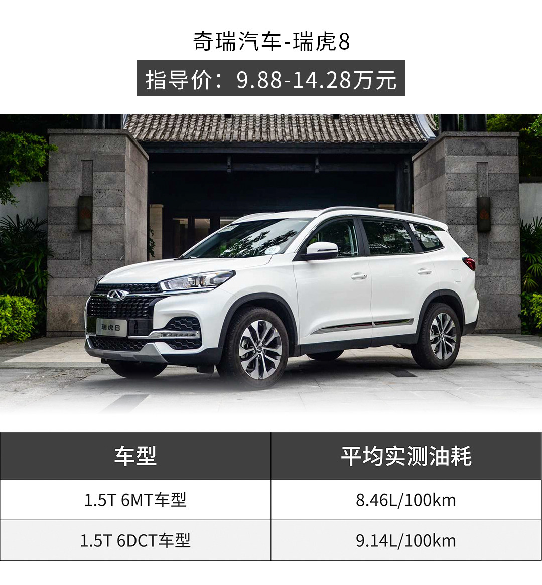 国产中型SUV里,近一年比较火的是瑞虎8,以及它的兄弟车型捷途X70。在这里教授就来讲讲大家都相对比较熟悉的瑞虎8。卖紧凑型SUV的价格,却有着中型SUV的身材,瑞虎8是一款性价比不错的家用SUV。优秀的油耗表现也符合它家用的定位,1.5T发动机动力性能虽然并不突出,但是胜在该发动机拥有不低的热效率,燃油经济性表现比较好,综合油耗为8-9L/100km。