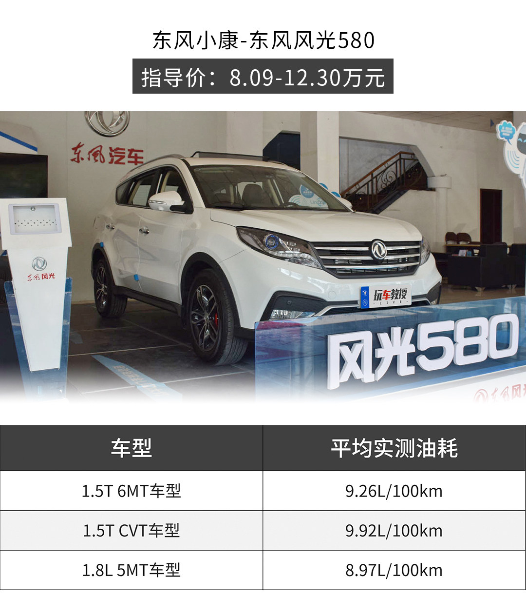 说到国产中型SUV,东风风光580也是不得不提的,它是2018年唯一一款年销量破10万的国产中型SUV。外观时尚霸气、空间宽敞、配置够实用、售价低等优点相信也无需教授多说了。但油耗方面,并没有特别令人满意。在路况比较好的情况下,综合油耗也到了每百公里9个多油的水平;而一般市区拥堵路况下,百公里油耗在12-13L左右,油耗算不上经济。