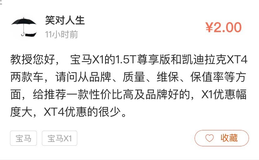 宝马贵为一线品牌,“蓝天白云标”无疑比凯迪拉克更有魅力,品牌来说建议宝马X1。原则上来说凯迪拉克性价比更高,不过宝马X1终端优惠巨大,优惠后性价比已经超过新款的XT4,加上XT4刚上市不久优惠放得很紧,如果现在买车建议入手宝马X1。当然啦,如果你看重XT4的“2.0T+9AT”动力总成和内饰的豪华感,建议再等个半年吧,时间长了价格会有惊喜。(PS:XT4 保值率稍高)