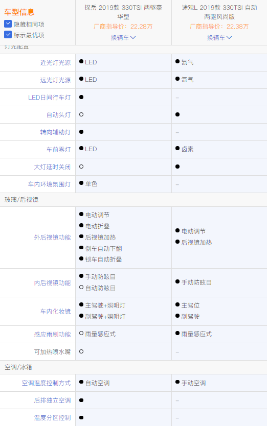 虽然都是大众家族的车型,不过探岳整体明显要年轻途观L许多,外观来说必须支持探岳。通过配置一对比两者的优势我们一目了然,途观L三维:4712*1839*1673mm,2791mm轴距,除宽度外途观L在空间上碾压探岳。反观探岳优势在于配置更加丰富,侧气囊,主动刹车,Alcantara座椅,电动座椅调节,LED大灯,后排自动空调···便宜1000元还多出这么多配置,实在太划算。如果你更在意空间我推荐途观L,从配置来上探岳无疑具有更高的性价比。
