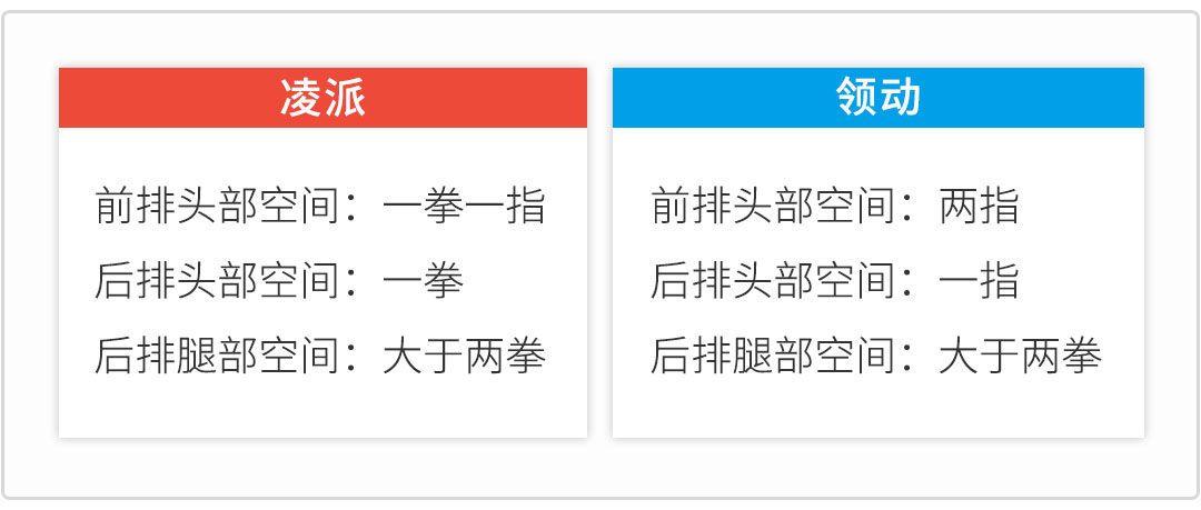 同样是4375px的试乘员对两车进行常规的空间测量,所得出的数据如表格所示,凌派更出色的空间表现也是意料之中,毕竟作为“空间魔术师”以及中国特供车型,其空间表现在同级中真的没谁了。而领动则相对一般,特别是后排头部空间比较局促。