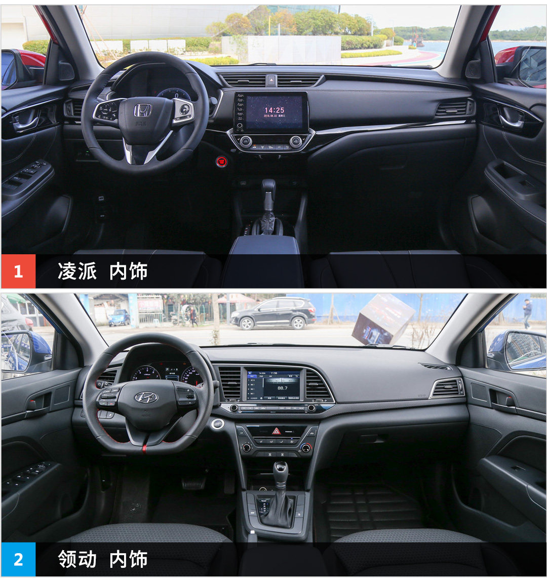首先是方向盘,凌派沿用了思域的设计,造型不错,仪表也一样,采用半液晶的设计,中控区非常简洁,但也有点过于简洁,档次感一般。而领动的方向盘则采用平底设计,并赋予红色点缀,运动感要强很多,不过中控区则略显复杂/凌乱,整体不如凌派。