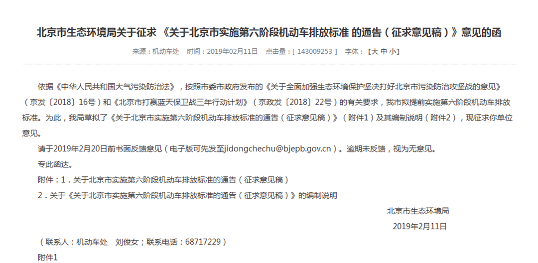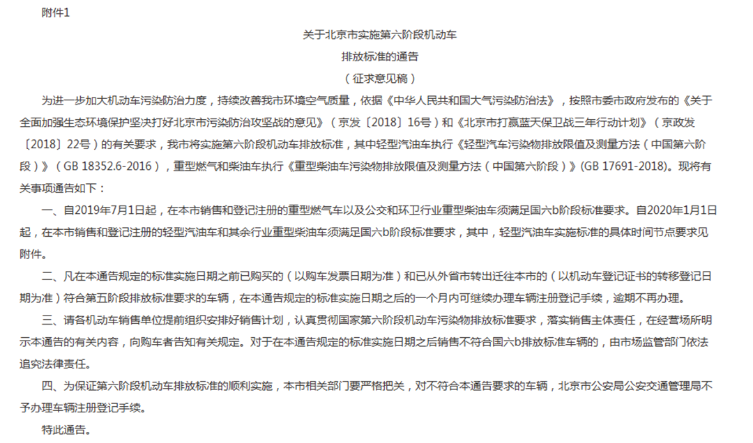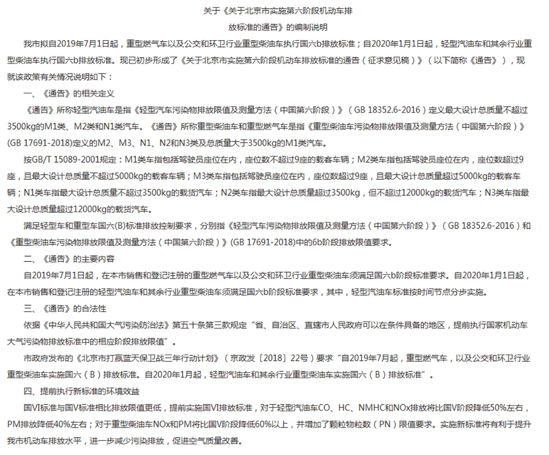 近日,北京市生态环境局发布《关于北京市实施第六阶段机动车排放标准的通告(征求意见稿)》。意见稿中拟提前第六阶段机动车排放标准时间表,从2019年7月1日起分步实施国六排放标准,第一步先主要针对重型燃气车和公交环卫领域的重型柴油车。此外,凡在规定的标准实施日期之前已购买的(以购车发票日期为准)和已从外省市转出迁往北京市的(以机动车登记证书的转移登记日期为准)符合第五阶段排放标准要求的车辆,在规定的标准实施日期之后的一个月内可继续办理车辆注册登记手续,逾期不再办理。(图片截自北京市生态环境局网站)