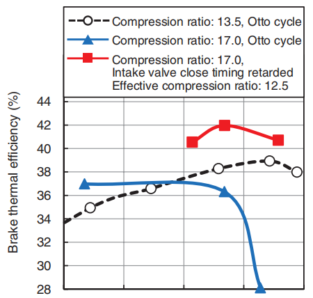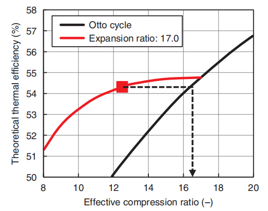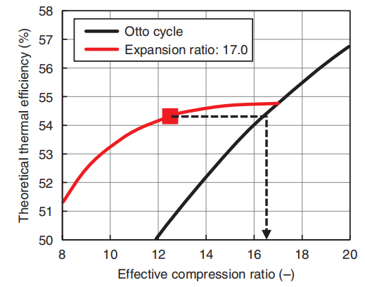 机械上压缩比是17:1,但由于气门迟闭一部分气体被排出,所以实际上被压缩的混合气体并没有理论上那么多。算下来这台发动机真正的压缩比只有12.5,但是它的膨胀比却是17。膨胀比高于压缩比就是阿特金森循环的特点,这种模式可以提高热转换率,阿特金森循环省油也就是这么来的。