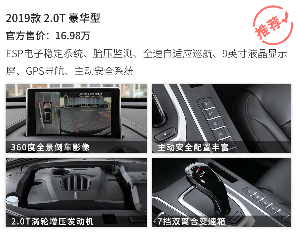 VV7入门版的配置几乎无可挑剔,无论想得到还是想不到的配置都一应俱全,全速自适应巡航、360度全景倒车影像、无钥匙进入以及主动安全系统都是标配,对VV7来说,入门既豪华。