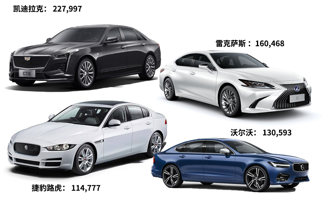 第二梯队是凯迪拉克、雷克萨斯、沃尔沃等,他们的销量在10万以上,凯迪拉克突破二十万,但其实那是以价换量得来的结果,雷克萨斯在进口而且部分车型还存在加价的情况下都有16万,这是凯迪拉克应该羡慕的。