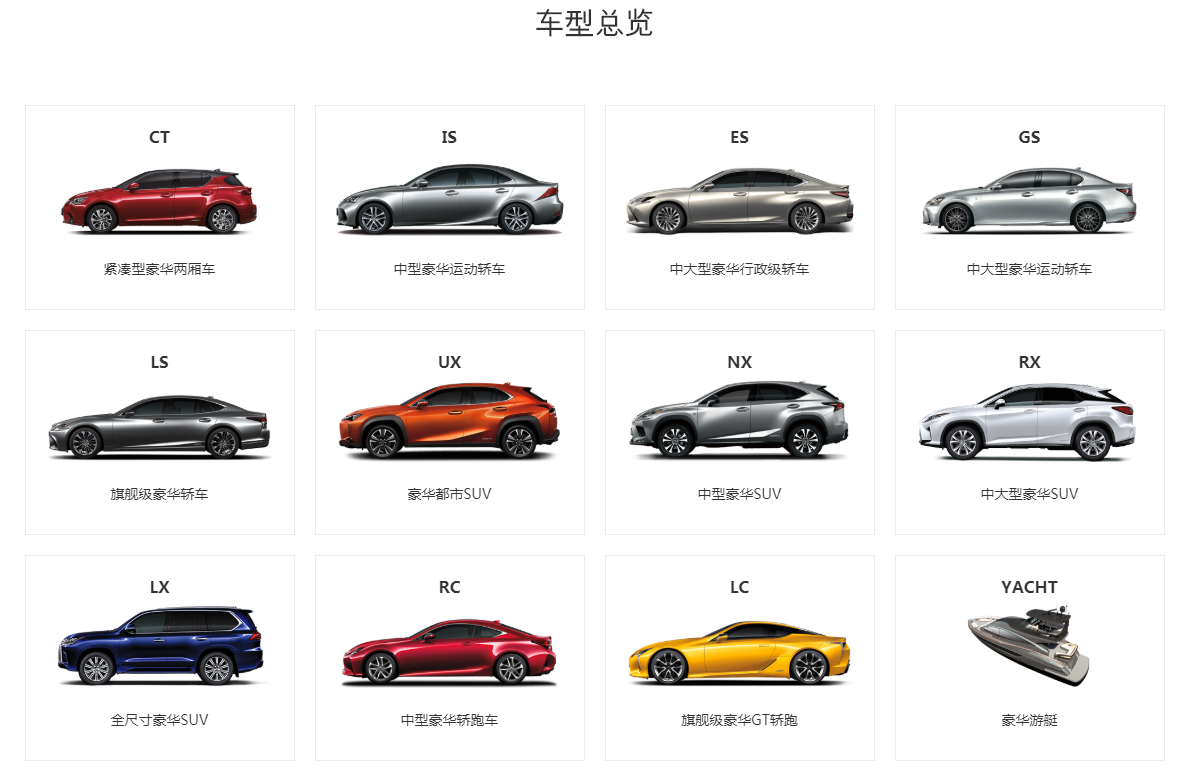 雷克萨斯好一点,有11款车型,英菲尼迪10款,是仅有的两个产品阵列突破两位数的品牌;其余的:沃尔沃9款;路虎6款(神行、极光、星脉、发现、揽胜、揽运)、