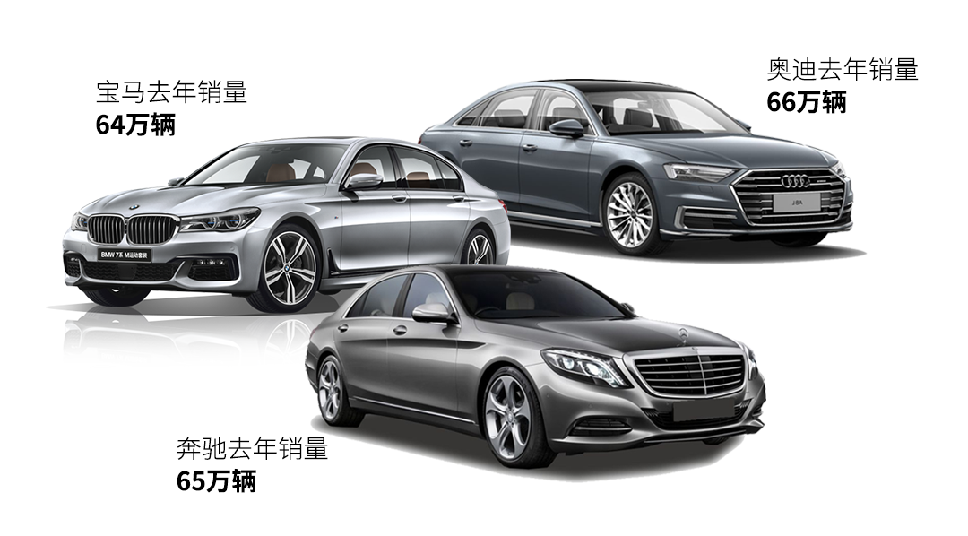 第一梯队是三巨头,奔驰宝马奥迪,去年的销量都在65万上下,分别是65万、64万、66万(由于统计口径和来源均有一些差异,本文销量数据四舍五入取整,不影响对比),他们的销量都在60万大关以上。