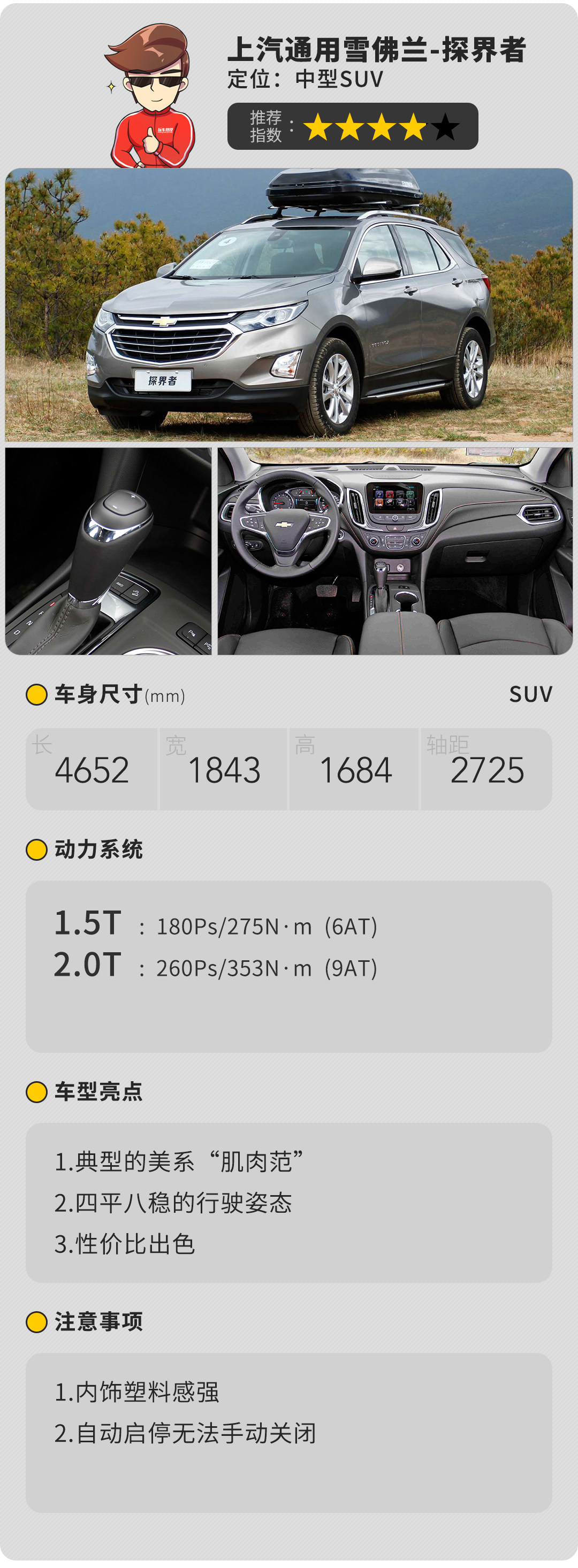 与昂科威同平台打造而来,并且拥有比前者更低的售价。探界者收获了“廉价版昂科威”的称号。整体维持了昂科威超9成的产品力,而用档次感稍次的塑料内饰去换取一个更低入门门槛不失为一个明智之举,而且随着时间的推移,探界者在市场中的优惠已经去到了历史的最高位。此外如果阁下是运动的发烧友,探界者有GS版本可供选择,专属的运动套件、悬挂、转向、油门响应都是向运动方向倾斜。