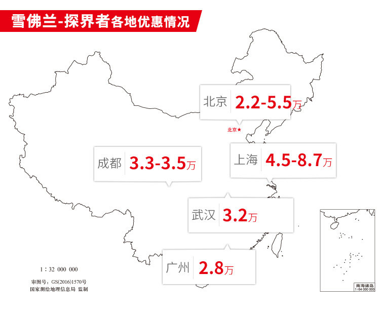 优惠详情:探界者在北京的优惠情况分为全现金优惠和搭配装饰、上牌、置换、买精品两种;上海的情况与北京类似,而广州、武汉、成都均是直接现金优惠。