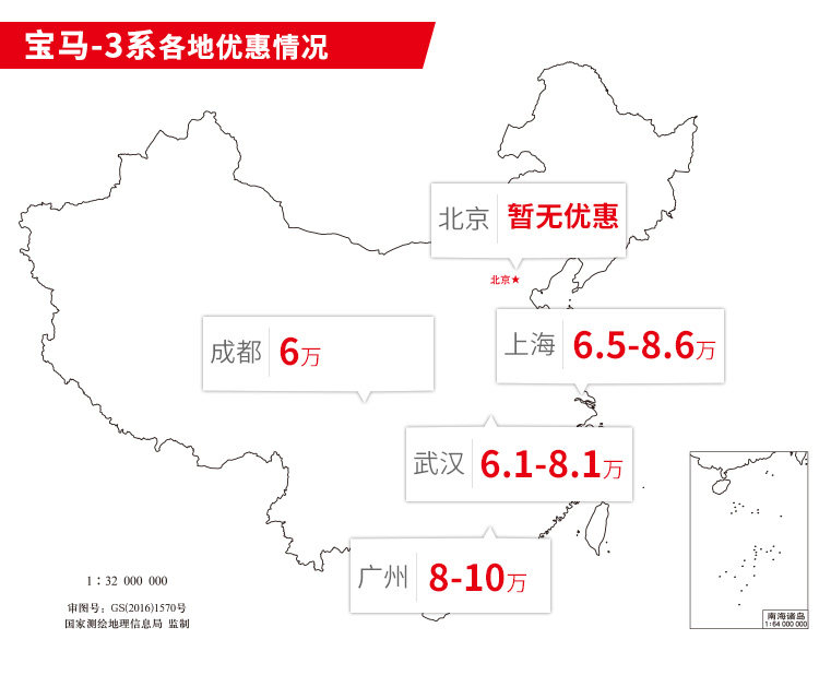 优惠详情:目前3系在北京地区处于平价销售的状态中,而优惠最大的上海和广州需要搭配加装饰、上保险、上牌;武汉则需要再加多一项店内贷款。