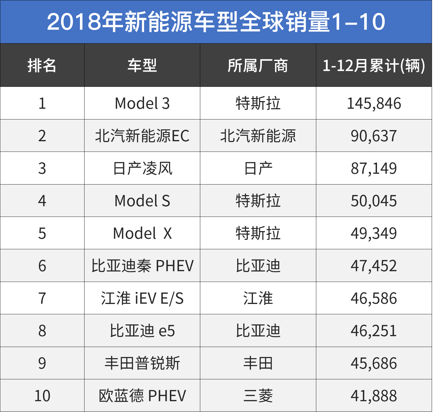 其实,新能源越演越烈的情况,也在全球其他国家上演。近日,EVSALES外媒就公布了2018年全球销量前20的新能源车型。从这份榜单中,可以看出新能源车型的巨大需求,且不断的上升中。特斯拉依然是老大哥,Model 3、Model S、Model X三款车型以145,846辆、50,045辆、49,349辆,占据了全球销量前五榜单。而Model 3更是以强硬的实力,稳住世界销量冠军宝座,与第二名拉开了巨大的差距。