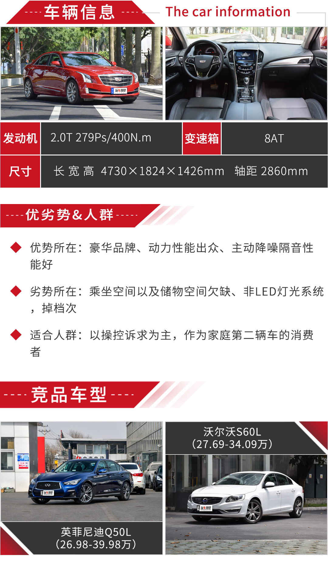 教授点评:在二线豪华车型里面,ATS-L也是比较多消费者关注的一款车型,而这自然离不开其出色的高性价比,高性价比体现在哪里呢?全系标配2.0T发动机、BOSE音响和Brembo刹车卡钳,而且做工用料也维持了凯迪拉克素来的高水准,整体档次感表现不俗。再者,相对比其他同级车型,它还给出了非常吸引人的购车优惠,对刺激众多消费者的购买欲望具有积极影响。不过,作为主打运动的中型车,ATS-L虽然加长了轴距,但空间在同级车里不见得有优势,勉强而言,也就是凑合够用,其次,它的悬架调校也是比较硬朗,在提供良好的路感的同时对其舒适性也产生了某些负面性的影响。