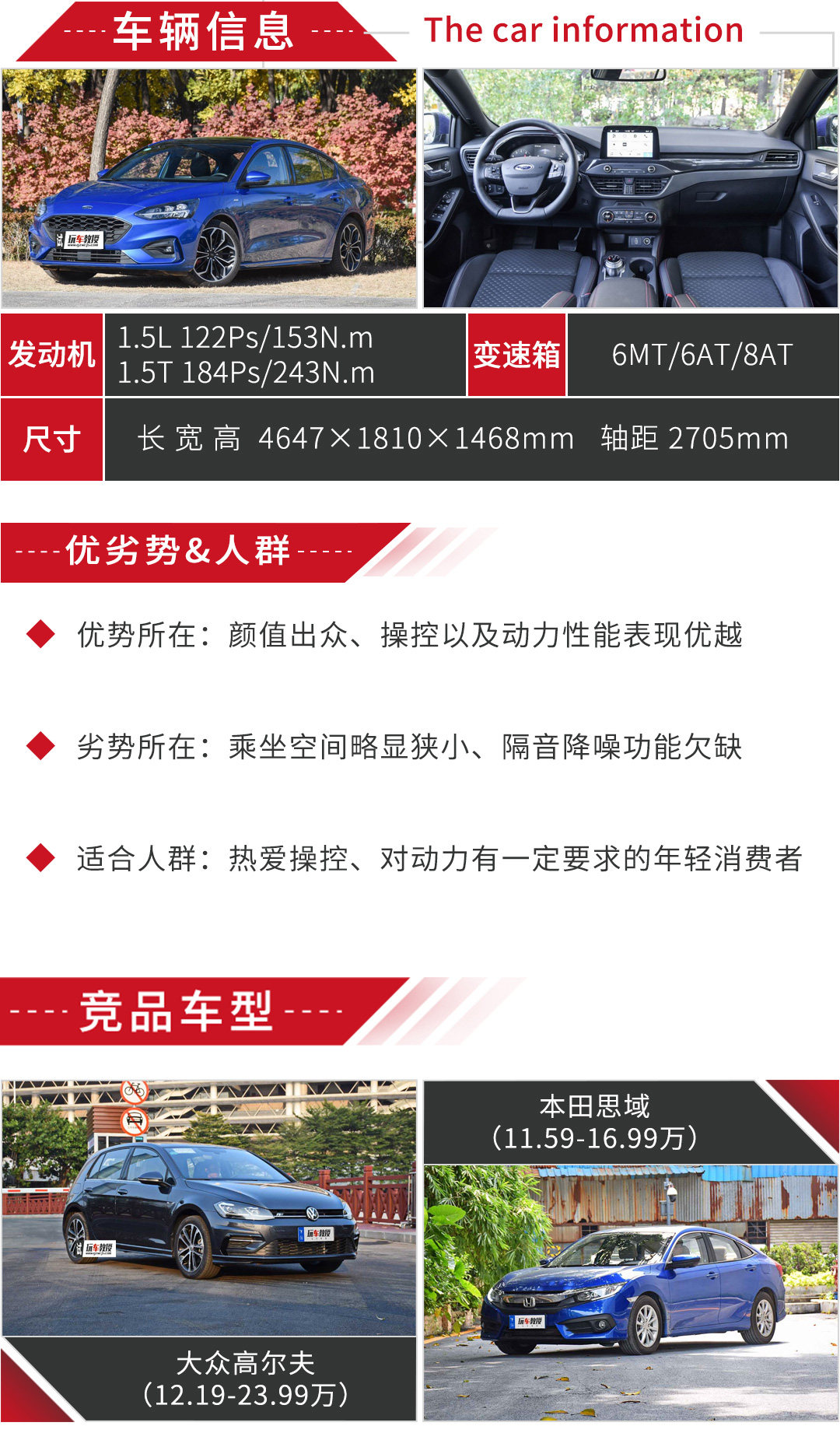 教授点评:福克斯给人印象最深的恐怕就是它那张马丁脸和ST-Line车型,不过呀,ST-Line版和普通版的车型对比起来,ST-Line很帅,而普通版就真的很普通了。即使换代了,操控依然是它的强项,而且得益于轴距的加长,虽不优越,但在空间性能上的短板确实有所提升。可惜的是油耗依然是它的短板,当然了,换个角度来说,这也是可以理解的,毕竟玩操控怎能不费点油呢?不过对于这款车的高低配的板悬和独悬分配,就不能忍了,怎么看怎么奇怪,还有就是竟然全系都已经是三缸机了,虽然三缸机福特向来就做得还不错,但目前而言还是很难令众多消费者所接受啊!