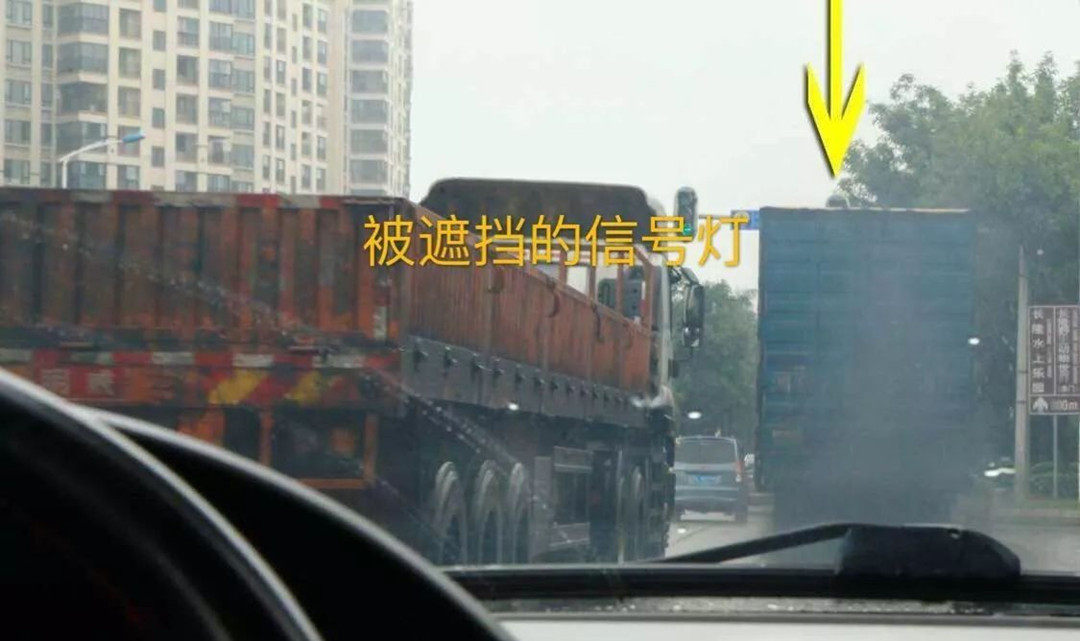 大车,特别是集装箱拖挂车、大客车,由于总高度比较高,而我们的小汽车视线高度又很低,所以我们跟在大车后面太近,大车就会遮挡住我们前上方的视线,导致看不到红绿灯,这时万一是红绿灯转换,我们因为看不到信号灯而稀里糊涂闯了红灯,那就很冤枉了,而且这种情况还不能申诉撤销处罚。