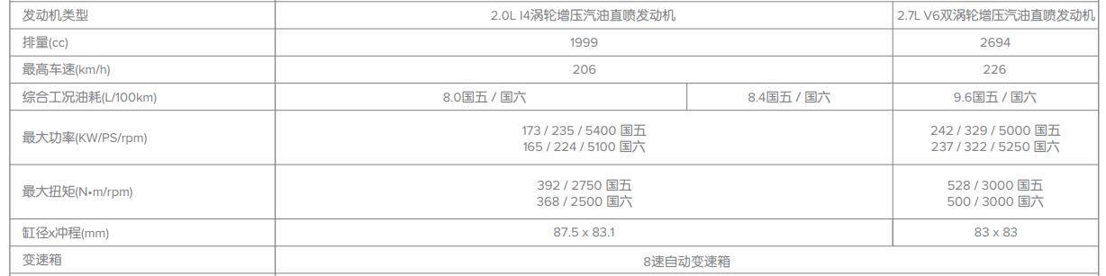 林肯航海家延续了MKX的2.0T和2.7T V6的涡轮增压发动机。其中,2.7T发动机可带来322匹的最大马力与500牛·米的峰值扭矩;另一款2.0T发动机效率也不差,能带来224匹的最大马力与368牛·米的峰值扭矩(上述动力数据针对的是国六车型)。与这两款发动机匹配的传动系统则有所提升,由现款MKX的6AT变速箱换成了8AT变速箱,更多的挡位和更绵密的齿比理论上能在燃油经济性和传动效率上相较老款有所提高。