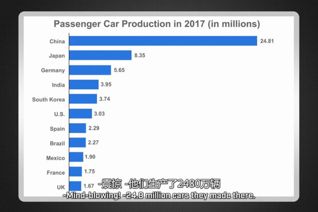 另外在这期的《The Grand Tour》节目当中,主持人统计了中国在2017年共生产了约2480万辆汽车,远远超过了全球地区其它国家,国内汽车的生产总量让他们感到震惊。
