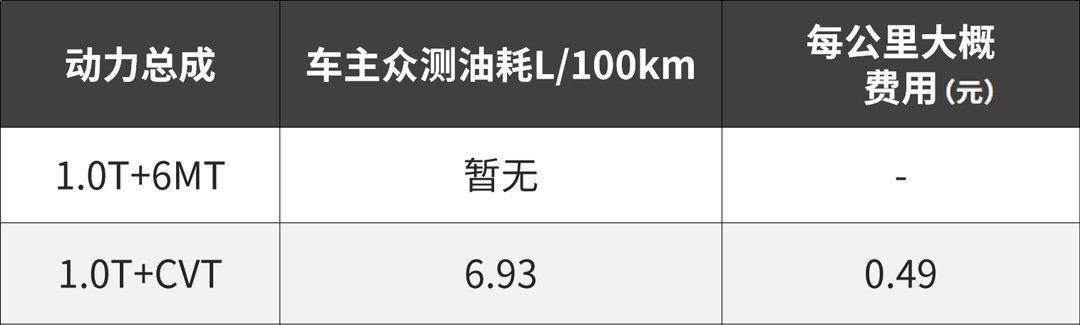 目前购买6MT车型的用户偏少,油耗数据暂时未能统计。而1.0T+CVT车型的油耗表现相当不错,提速给力也很省油!