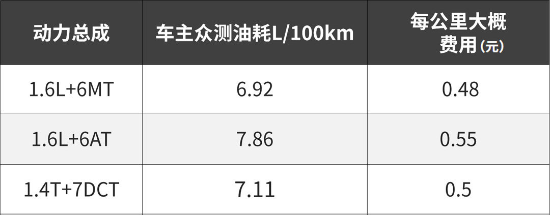 从车主回馈的实际油耗数据中我们发现,1.6L+6MT、1.4T+7DCT车型的油耗控制得不错,这很大程度上取决于手动挡、双离合变速箱的高传动效率,而1.6L+6AT车型油耗相对一般,毕竟AT变速箱带有液力变矩器进行动力梳理,其中会有一定的动力损耗,整个油耗表现可以接受。