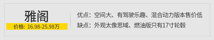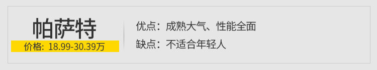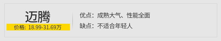 国内B级车多年的销量冠军,称之为标杆也不为过。加速、刹车、油耗和静谧性都排得上B级车的第一梯队,性能全面无明显缺点是迈腾最大的优点。另外,迈腾的外观和内饰比较庄重,35+的商务人士可以重点考虑。