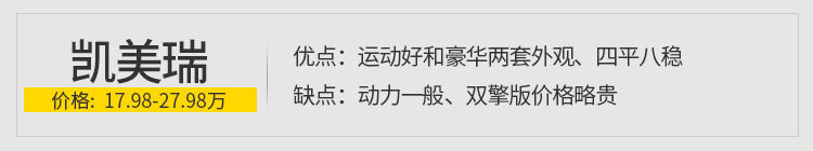 凯美瑞上外观有豪华套件和运动套件两种,不过两者的动力和避震软硬度是一样的。在四台日系车横评中,凯美瑞的表现是最均衡的,避震比较舒适又不容易顶到塔顶,车身降低了姿态又不会特别运动。2.5L+8AT的动力加速不算快,但省油。所以不知道自己想要什么,买凯美瑞不会出什么乱子。