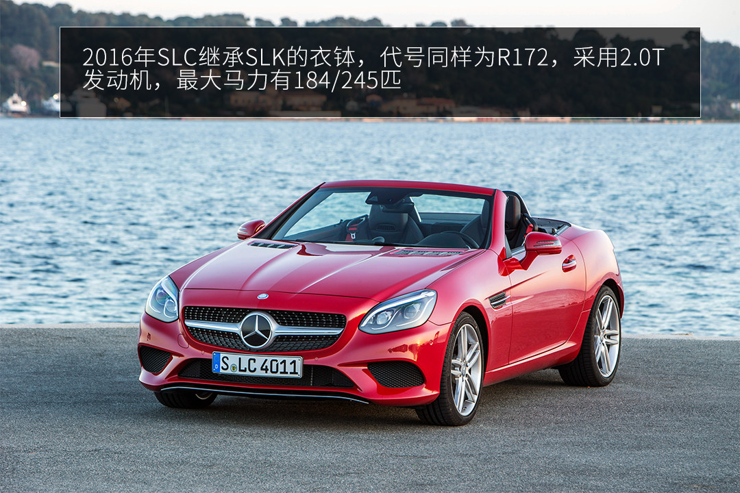 2016年SLC继承SLK的衣钵,代号同样为R172,采用2.0T发动机,最大马力有184/245匹,AMG系列采用入门的43系列,3.0T双涡轮增压发动机,最大367马力,峰值扭矩为520牛·米。
