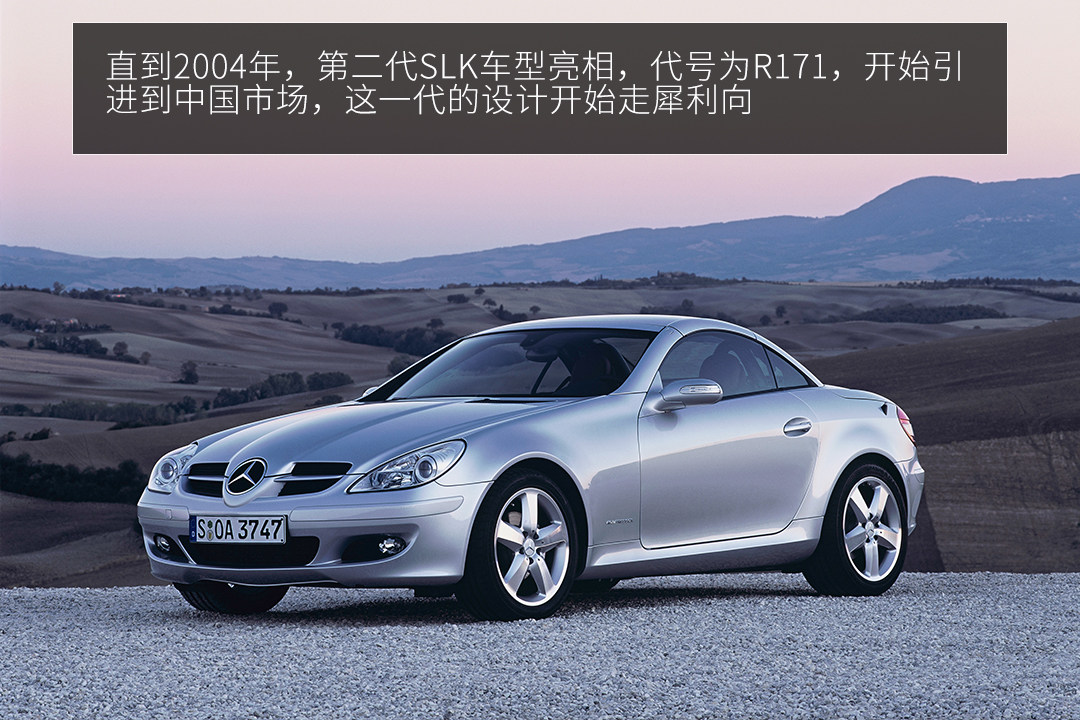 直到2004年,第二代SLK车型亮相,代号为R171,开始引进到中国市场,这一代的设计开始走犀利向,也开始走向现代化,也开始使用涡轮了;