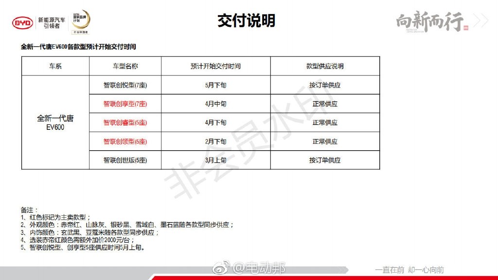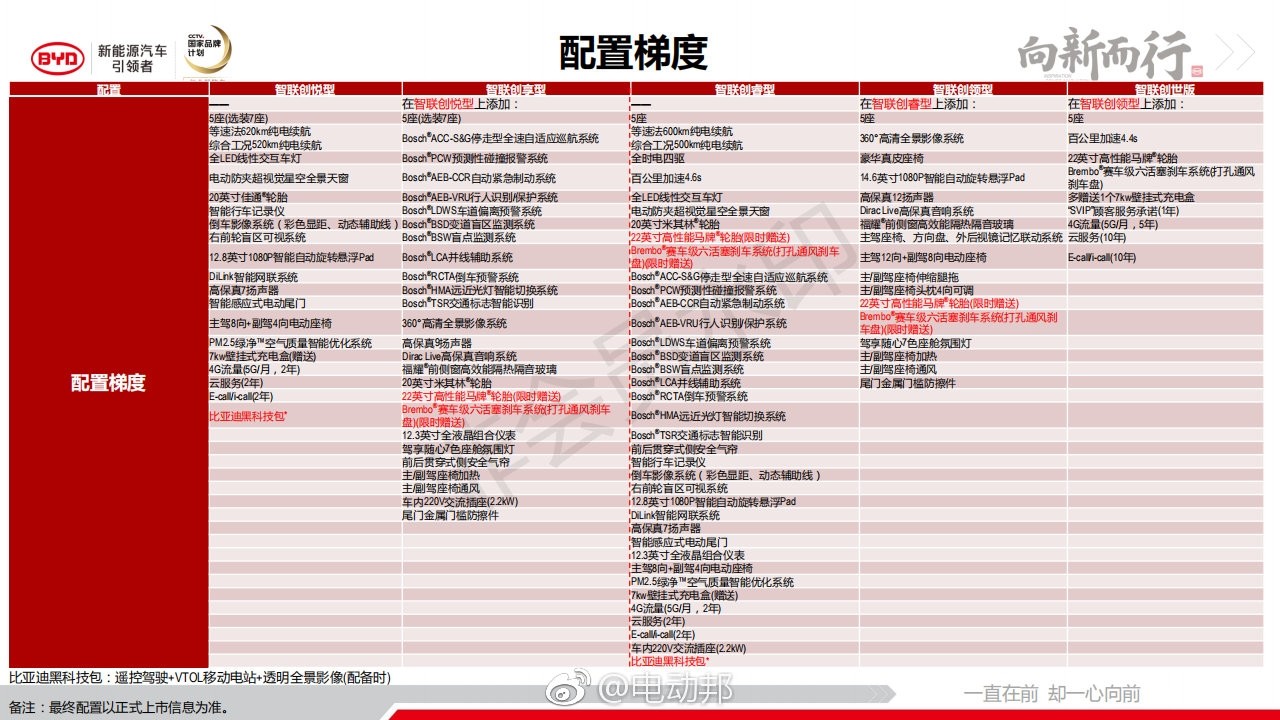 日前,有媒体曝光全新一代比亚迪唐EV600配置清单,从曝光的图片来看,唐EV600分为5个配置,分别为智联创悦型、智联创享型、智联创睿型、智联创领型和智联创世型,其中智联创悦型、智联创享型提供选装7座,新车将在2月下旬至5月下旬,按照不同车型陆续交付。新车全系标配LED行车灯、全景天窗、比亚迪Dilink智能网联系统、遥控驾驶以及电动尾门等功能。在动力及续航方面,新车综合工况巡航为520km,60km/h匀速续航里程为620km,百公里最快4.4s,百公里能耗低至17.3度电。此前,新车在此前广州车展上已正式开启预售,预售价格区间为26-36万元。(图片来源:电动邦)