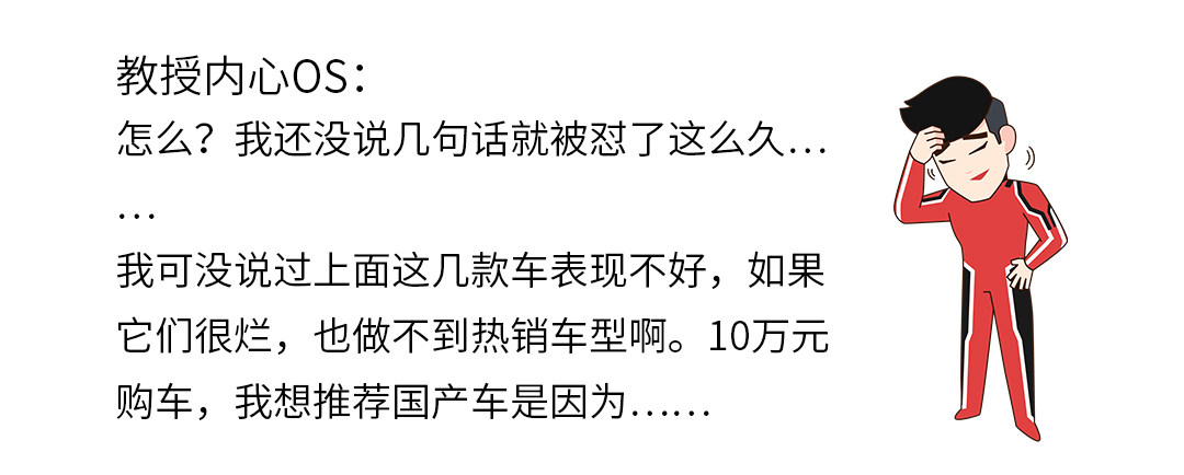 然后,教授也必须要肯定10万元是有表现不错的国产车,值得大家去考虑。国产车这些年不断地在进步,起码在设计上、配置上、质量上都能看到明显的进步。所有我们去承认它们的努力,有这么难吗?