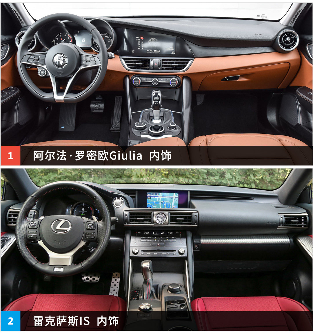 两车的内饰和外观一样,普通版都平平无奇。Giulia的四叶草版具有超大的换挡拨片和碳纤饰板,营造出不错的战斗感。IS的F SPORT版具有可物理移动的仪表和红色内饰,有不错的档次感,而且IS 的用料也非常厚道。