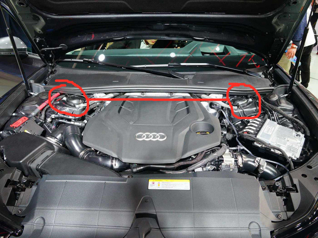 奥迪A6 3.0T机舱,引擎大部分位于前轴之前(看悬挂塔顶)