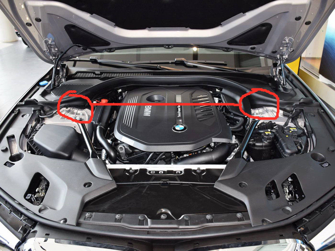 宝马5系3.0T机舱,引擎有一半位于前轴之后(看悬挂塔顶)