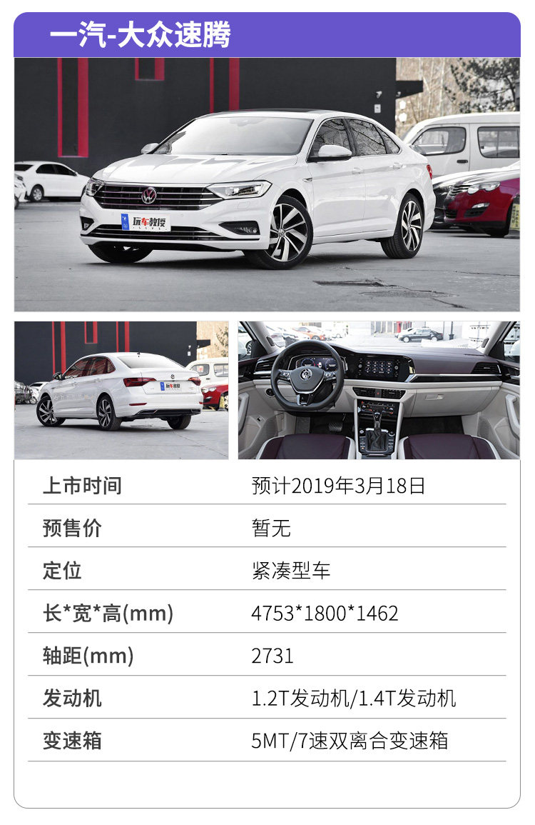 车型小结:全新速腾预计于3月18日正式上市,国产版本车型基本沿用了海外Jetta(速腾)设计,全新速腾也跟上了节奏,用上了MQB平台,轴距相比海外版本增加了45mm,与老款相比增加了80mm,车内空间的提升立竿见影。而动力方面依旧沿用了1.2T与1.4T发动机,其动力总成成熟度较高,口碑也有目共睹。成熟的动力、全新的设计、更大的空间以及大众品牌加成,大众对全新速腾信心十足不无道理。