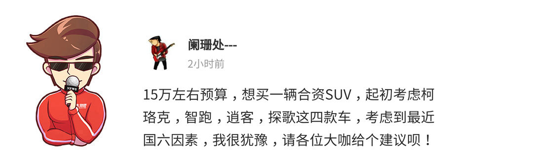 对于国六问题,现在基本大部分新车都已经上国六了,除非有些车型在改款之际,可能会有部分库存的国五车型。这四款车型中,柯珞克的动力选择少,动力不算强,智跑的小问题较多,逍客的技术比较旧。最值得推荐的只有探歌吧,里里外外都充满活力,现在大众的双离合体验还是不错的。而且目前探歌的优惠也不错,以广州地区为例,提供2万元的优惠,并且还可争取免息政策,是目前最受欢迎的一款合资紧凑型SUV之一。
