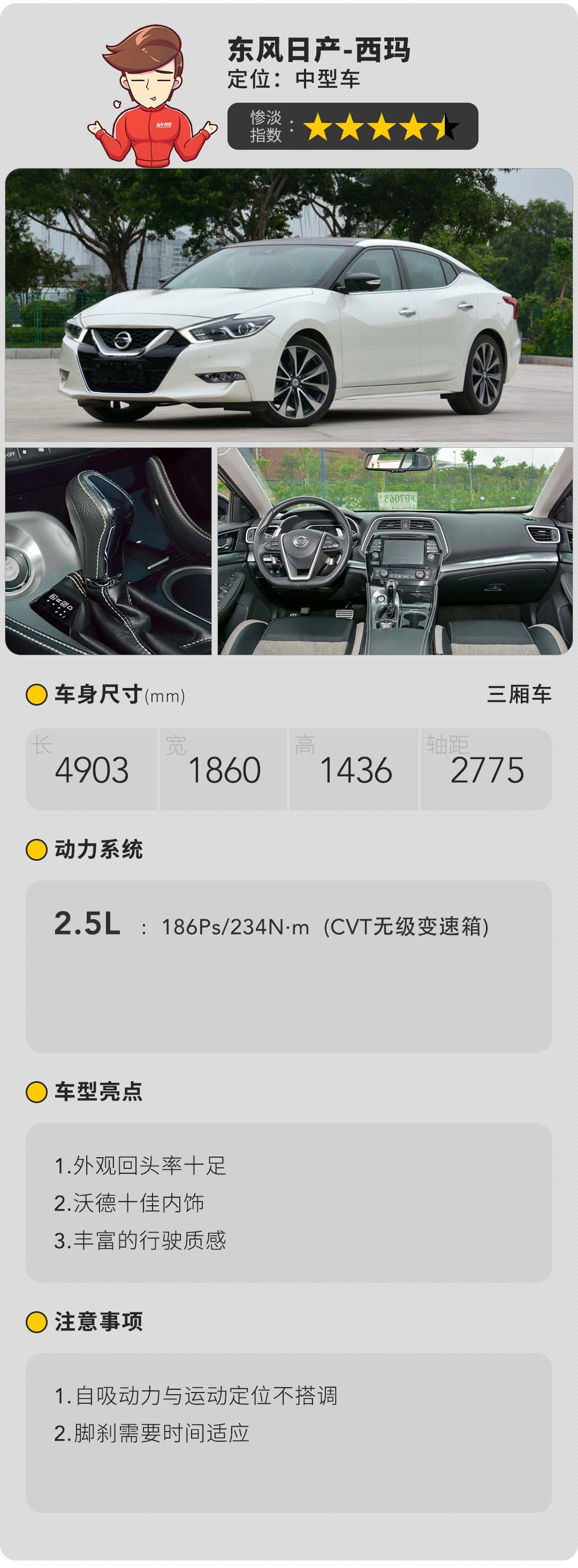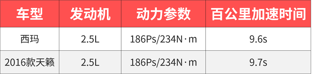从外观到底盘,西玛做足了运动的准备,可惜的是采用与老款天籁相同的动力总成,2.5L发动机用的还是四缸结构匹配的也是无趣的CVT变速箱,百公里加速9.6秒仅比老天籁快了0.1秒,将近10秒的0-1时间与时下那些涡轮“7秒男”相比相去甚远,运动快感就更是无从谈起了。