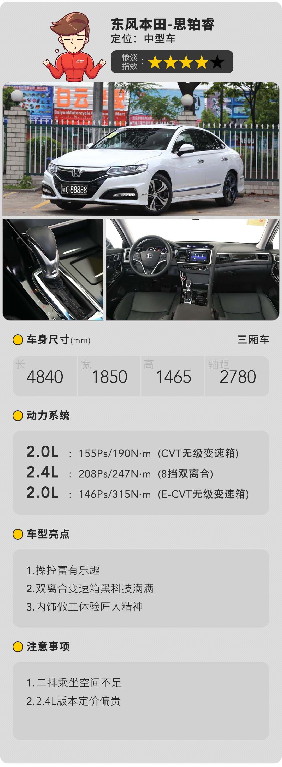 思铂睿的“失败”要归结于其错误解读中型轿车的消费者画像,将精华全部浓缩在2.4L车型身上,集合了2.4L大马力发动机、带液力变矩器的8挡双离合变速箱、本田看家的Honda SENSING安全超感系统的2.4L车型实力的确要高出同级车型一筹,但是其22.99-26.79万的定价已经触及BBA三强入门级轿车范围,在BBA品牌巨大的面子加成面前,这些亮点都显得黯然失色了。同时对于中型轿车的消费者而言他们更乐意去选择一辆以家用为主,运动为辅的车型,而不是以运动为主,家用为辅的思铂睿。