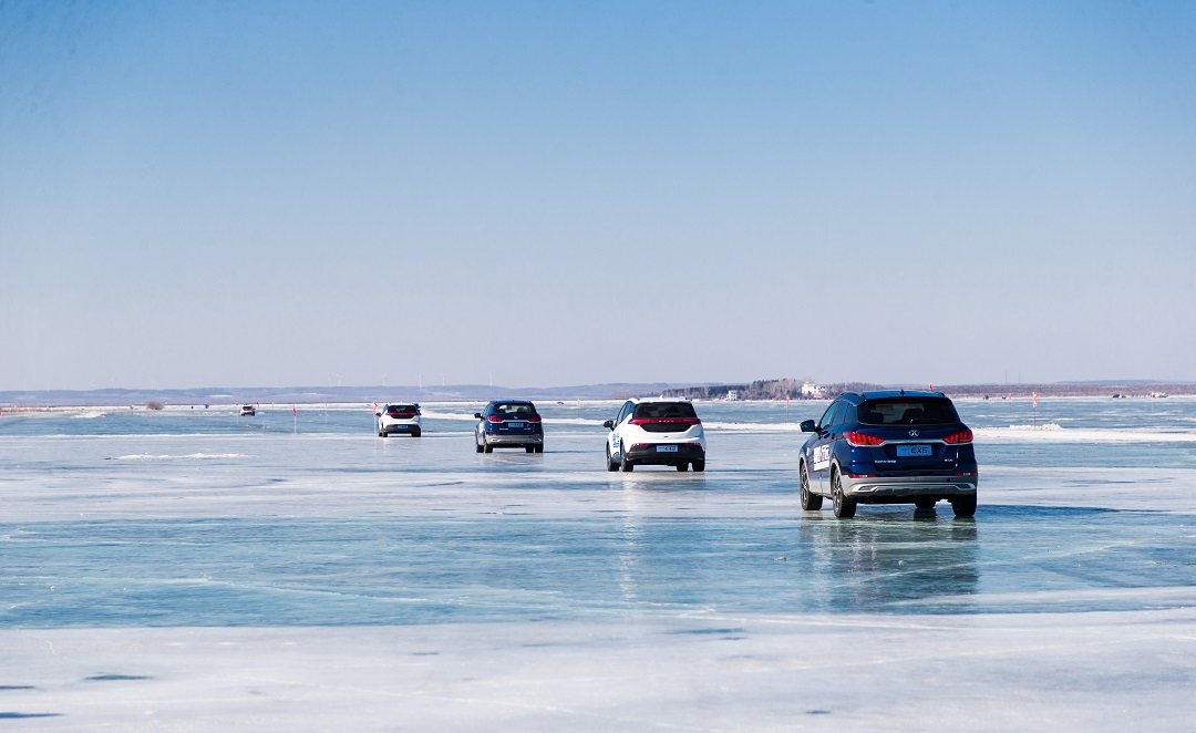 随后是亲身试驾了一番,在这个巨大的冰湖面上,相信电动车会比汽油车会耍得欢一些,因为电机随传随到的动力响应像极了人在冰面上走,如果是汽油车,变速箱响应不够快的话肯定会有点拖沓的,加之广阔的冰面让距离感和速度感进一步降低,所以动力响应需要更快地跟上驾驶者的意图才行,才能耍得更欢,从这个角度来看,电动车比汽油车更好玩。