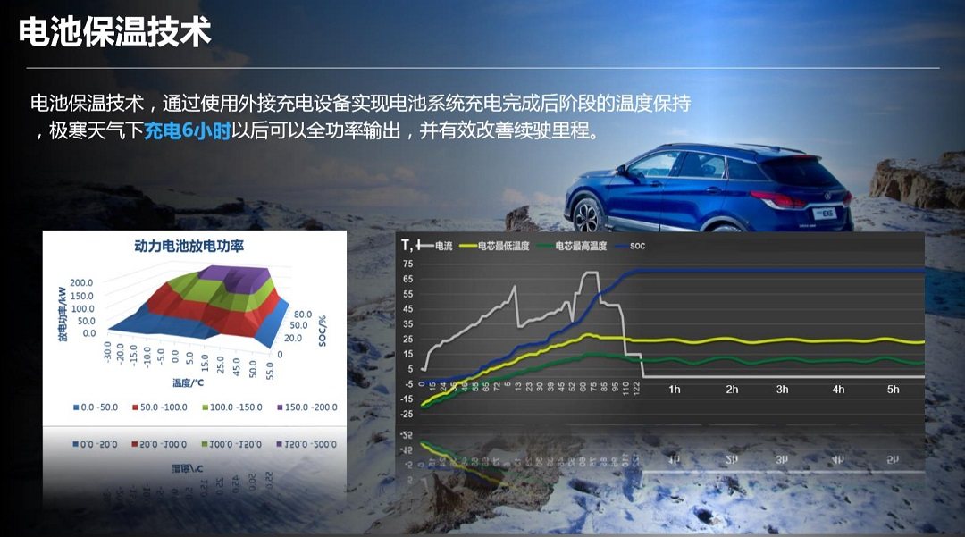 同时具备保温功能,在慢充的状态下充完电之后如果不拔掉充电枪的话,保温功能会通过外来电对电池对进行保温,保温时间长达6小时,这样晚上充完电,基本是多寒冷的动态,也能避免充电结束后低温导致的电池可用容量损失,如此一来全天候电池保温技术,就可以确保各种季节温度下都有良好的电池性能。