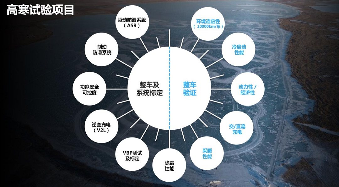第二个是整车验证,其中又包括环境适应性、冷启动性能、动力性能/经济性能、充电性能等。在环境适应性中试验,每辆车需要经过1万公里的试验,包括测试场内和实地场外测试,场内包括冰雪路面、鹅卵石、腐蚀路、ABS路面等,场外的话会去到黑河市周边以及高速公路。
