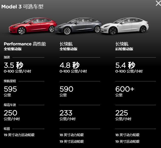 对比目前国内在售的特斯拉Model 3,Model 3这方面的优势明显。它共有3款车型;其中,Model 3高性能全轮驱动版0-100公里/小时加速仅需3.5秒,而时速最高可达250公里/小时,这对于一款中型车来说表现算优秀。595公里的最高续航能力,也基本满足车主的用车需求。