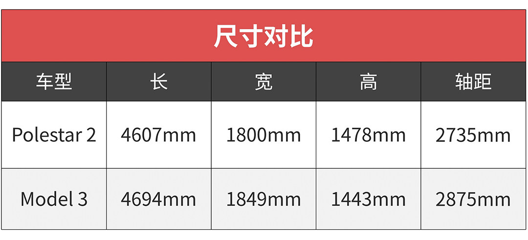 Polestar 2的长宽高分别为4607mm/1800mm/1478mm,轴距为2735mm。Model 3的长宽高分别为4694mm/1849mm/1443mm,轴距达到了2875mm,以主流中型车的尺寸来看,Model 3车长并不算长,轴距也很常规。Polestar 2则要比Model 3来得更紧凑,定位为紧凑型车。