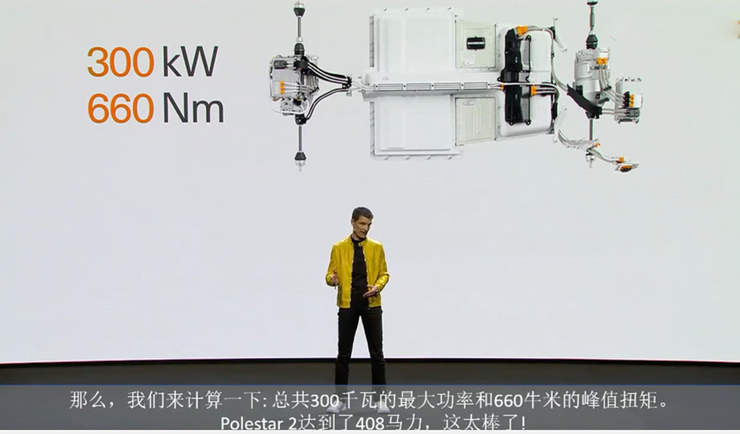 Polestar 2 基于CMA平台打造;所搭载的电池容量为78kWh(国内版本为72kWh),NEDC续航里程为500km;前后双电机、四驱系统,最大输出功率可达300千瓦(408马力),最大扭矩为660牛·米,百公里加速时间不到5秒。至于不到5秒到底是多少秒?官方只给出一个比较含糊的答案:目标为4.7 秒。