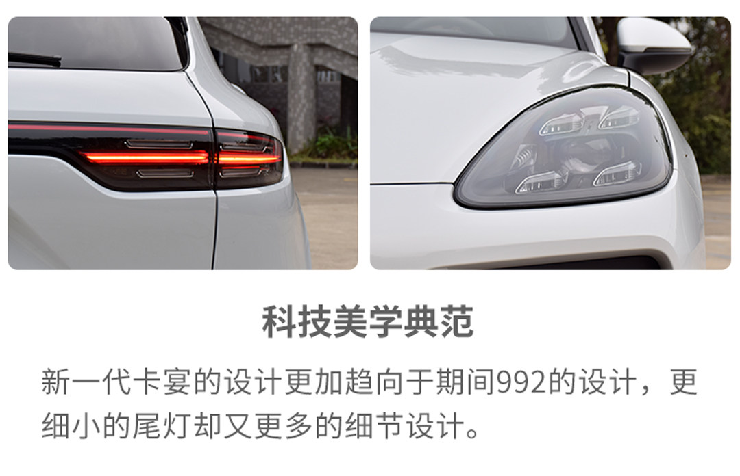 Cayenne S的外观在上一代的基础上进一步进化,从原来相对臃肿、健硕的身形转变成如今穿衣显瘦,脱衣有肉的类型,更加小面积的尾灯似乎更加低调,但在晚上亮起来的时候,让路人远远就知道这是一台保时捷。不知道?没关系,悬浮在尾灯之间的标志会提醒你。