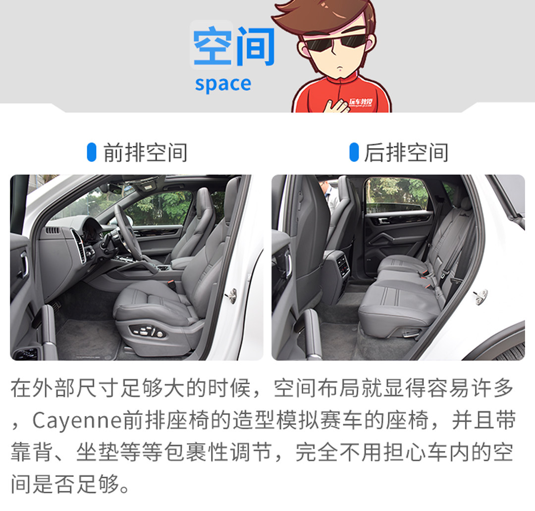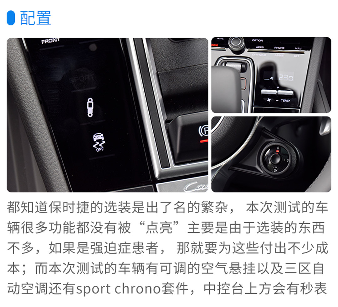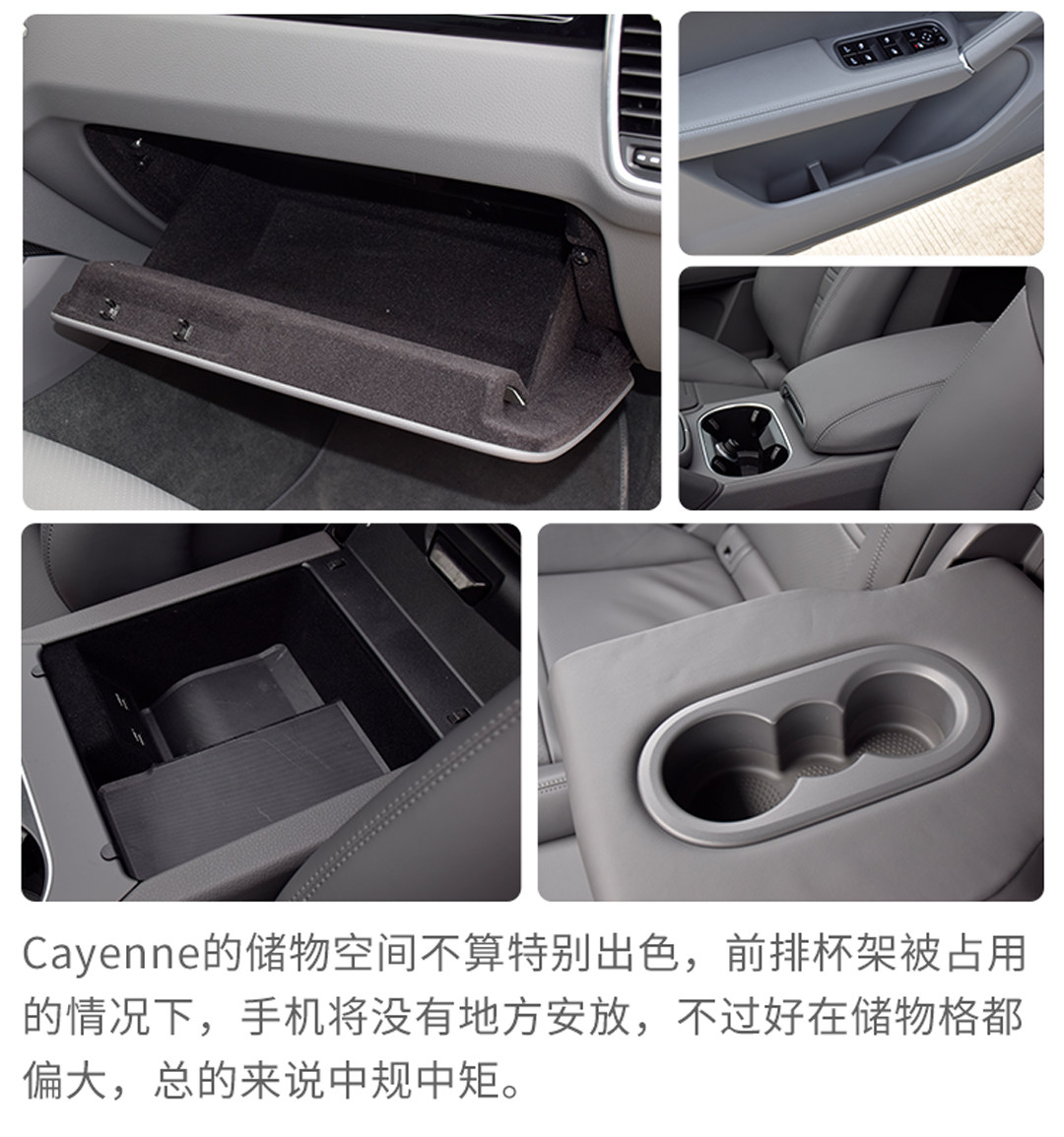 空间不是Cayenne S的长处,但前后排给到你的空间体验也绝对不会差,多向调节的座椅,不但能够调节靠背和坐垫,还能够调节坐垫的包裹性和靠背的包裹性以及腿托的长度,再加上电动调节的方向盘,无论是什么身材的驾驶者都能找到一个合适的驾驶姿势。相对来说,储物空间是Cayenne的短板,这一套内饰虽然看起来非常有逼格,但使用起来,如果在杯架被占用的情况下,手机跟钱包将会无处安放,再加上高速卡呢?