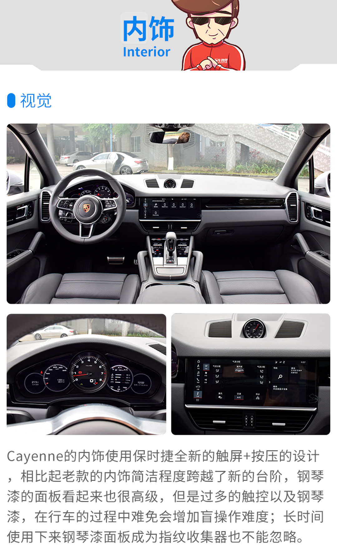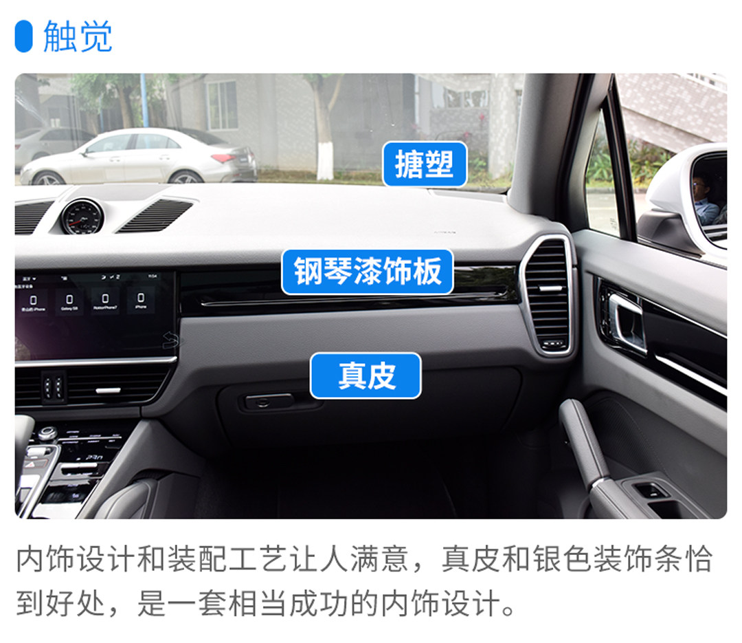 内饰也是保时捷全新的触控+按键式,既在更加体现科技感的同时,也没有抛弃传统的按键式感受。本次试驾的车辆有选装真皮内饰,所以在门把手,中控台等多处都会有真皮包裹,皮质细腻。全新的UI设计加上全新的换挡杆,在保留原来清晰的中控布局的同时,做到增加高级感。多处的钢琴漆面板在日常使用的时候难免会成为指纹收集器。