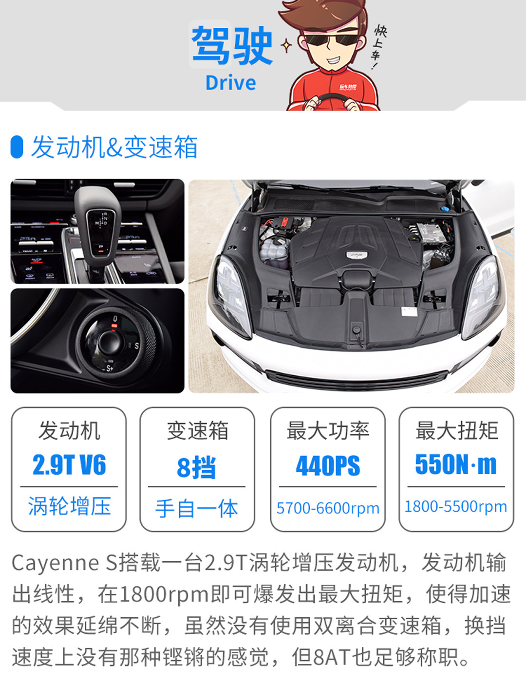 2.9T的双涡轮增压发动机,有着绵密的输出特性,不会让你觉得有老式大涡轮那种过分夸张的turbo lag,从起步开始就能给你足够线性的输出,当你kick down以后,440匹的动力会让你嘴角不自然上扬,甚至会感叹为什么一台SUV竟然可以做到这种地步,这种体验。