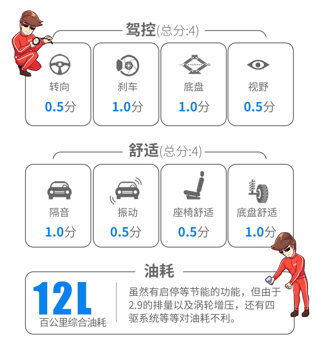 由于车辆使用的是四条四季胎,对于性能没有很大的帮助,即便是超大尺寸的刹车卡钳和超大直径的刹车碟,由于轮胎抓地力不足,使得最终获得一个相对一般的成绩,如果换上四条更加趋向性能的轮胎,成绩应该会进一步提升。