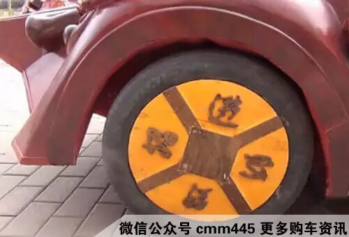 车轮轮毂采用金丝楠木装饰着,招财进宝四个木雕刻字,当车轮滚动时,预示着财源滚滚的意思。
