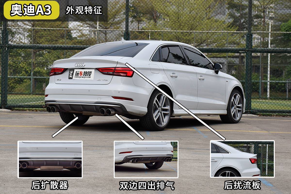 如果说宝马1系的线条设计是肌肉感,那么奥迪A3的线条就是刀锋,这种锋利的车身造型考察的不仅是设计师的想象力,更是对制造部门的考验。车尾双边四出的排气、后扩散器和小鸭舌扰流板进一步提升了自己的运动感。